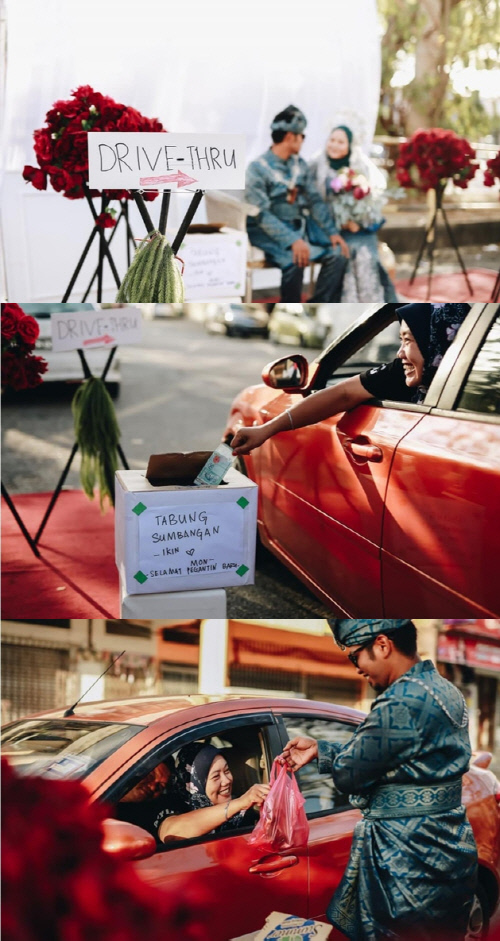 マレーシアのウェニング会社ディナスブライダルは3月16日、ドライブスルー方式で結婚式を行った新郎と新婦の写真をフェイスブックに掲載した。この書き込みには「いいね」が約4400個、「シェアする」が1万1088回を記録し、オンラインで大きな人気を集めた。