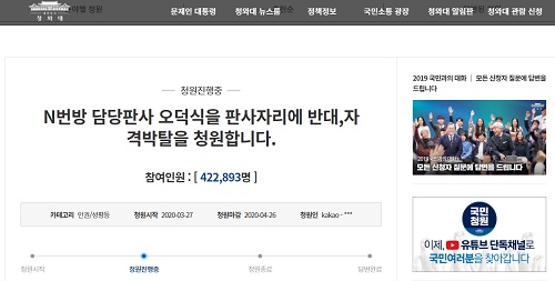 韓国大統領府に設置された「国民請願」の影響で、3月27日に上がった「n番の部屋担当判事オ・ドクシクの判事席を反対、資格はく奪を請願します」との請願には5日間で42万人を超える署名が集まった。