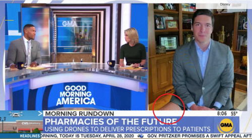 4月28日(現地時間)午前に放送されたABCニュース『グッドモーニングアメリカ』で、ABCの放送記者であるウィル・リーブは、ドローンで処方薬を患者に持ってくる薬局の事例を報道する生放送に出演した。