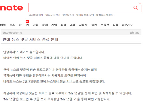 先立ってNATEは6月30日の公示を通じて、「芸能ニュースのコメントが放送番組や芸能人を応援する本来の機能ではなく、逆機能になることを懸念するユーザーの意見を反映した」と明らかにし、7月7日から芸能ニュースのコメントサービスを終了する予定と発表した。