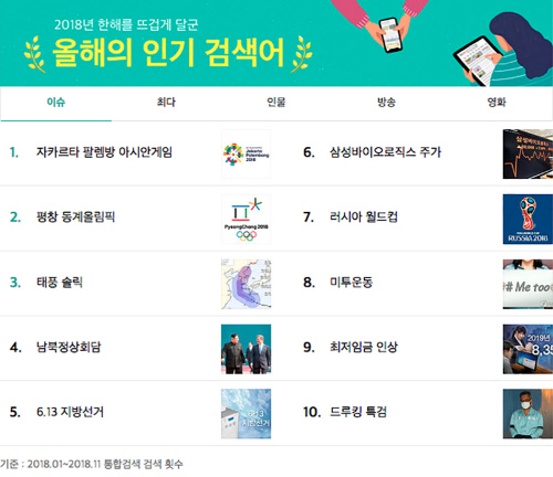 イシュー部門の3位には去る8月に朝鮮半島に上陸した「台風ソルリク」が入り、「南北首脳会談」(4位)、「6.13地方選挙」(5位)、「サムスンバイオロジックス株価」(6位)、「MeToo運動」(8位)、「最低賃金の引き上げ」(9位)、「ドルイドキング特検」(10位)など政治・社会問題がトップ10に多く入った。