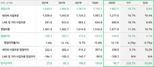 連結営業利益は、2019年第2四半期に行われたLINE Payのマーケティング費用消滅の影響で、前年同期比79.7%も増加した2306億ウォン(約231億円)だ。そして当期利益は907億ウォン(約91億円)となった。