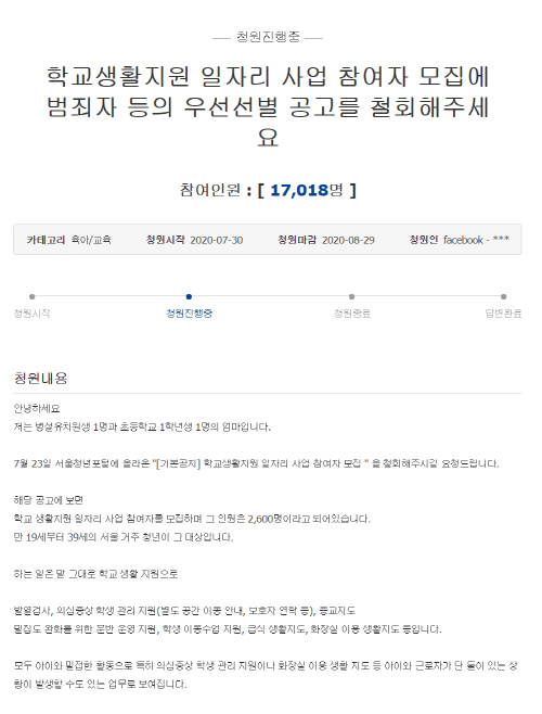 ソウル市が公告すると、「幼稚園児1人と小学校1人の母親」と明らかにした請願人が、大統領府の国民請願掲示板に請願文を載せた。