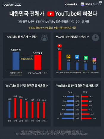 去る9月のYouTubeアプリの韓国内ユーザー数は、約4319万人。全人口(5178万人)の約83%に達する数字だ。YouTubeアプリの1人当たりの月平均使用時間は29.5時間だった。