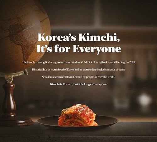 「韓国のキムチ、世界の人々のためのもの」というタイトルの広告は、「キムチ文化は2013年にユネスコ人類無形文化遺産に登録された。歴史的に数千年間、韓国の代表的な食文化をつないできた」と説明した。