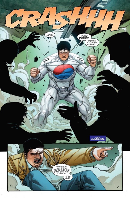 公開されたプレビュー画像には、胸に太極旗が描かれた白い全身タイツ姿の韓国人ヒーローが確認できる。