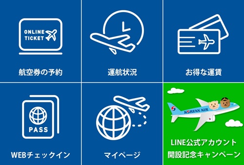 大韓航空LINE公式アカウントでは、運航スケジュールやお得な運賃、SKYPASSなどに関する情報を配信していくほか、LINE上から航空券の予約、運航状況確認、WEBチェックインへリンクがされており、利用が簡単になるという。またLINE限定のプレゼントキャンペーンやイベントなども多数行い、快適サービスが提供される。