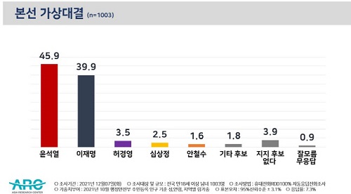 今回の大統領選挙候補の支持率を調査した結果、ユン・ソギョル候補が支持率45.9%、イ・ジェミョン候補が39.9%となった。