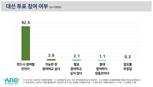 大統領選挙に参加するかどうかについては、「必ず参加する」という回答が92.6%を占めた。「できるだけ参加したい」が3.9%、「あまり参加したくない」が2.1%、「絶対に参加しない」が1.1%で、参加するという回答が圧倒的だった。