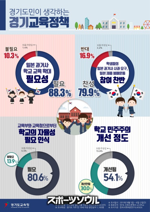 京畿道教育庁によると、「慰安婦問題、強制徴用労働者の賠償問題など、日本の過去史に対する学校教育の拡大」を問う質問に、道民の10人中8人(88.3%)が必要であると答えた。