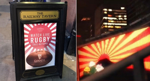 アイルランドの通信会社のひとつであるボーダフォンが作った映像の中にはラグビー・ワールドカップを応援する旭日旗が登場し、英国内のラグビー・ワールドカップ中継を紹介するパブ案内板にも旭日旗が登場するなど、ネチズンの情報提供でわかった。