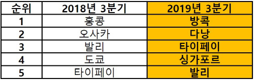 前年同期(2018年第3四半期)は、1位香港、2位大阪、3位バリ、4位東京、5位台北だったため、東南アジアの都市の順位が大きく上がったことがわかる。逆に日本の大阪、東京は今回トップ5に入らなかった。