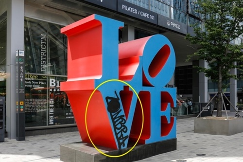有名ポップアーティスト、ロバート・インディアナが制作した「LOVE」のオブジェには、黒いスプレーで「ZOMBRA」という文字が書かれている。警察によると、5月21日、外国人とみられる男性が落書きする姿が監視カメラに収められていたという。