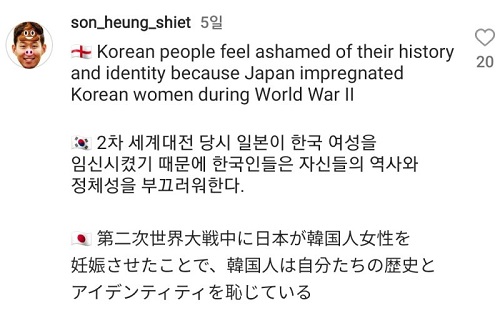 ソ教授は「何より点(.)を活用して、日本軍人が慰安婦を劫奪する場面を絵で表現し、コメント欄に持続的に載せていることも問題」とし、「またソン・フンミン選手の肖像権を無断で盗用して自分たちのアカウントプロフィール写真として使うなど、本当にとんでもないことが行われている」と説明した。