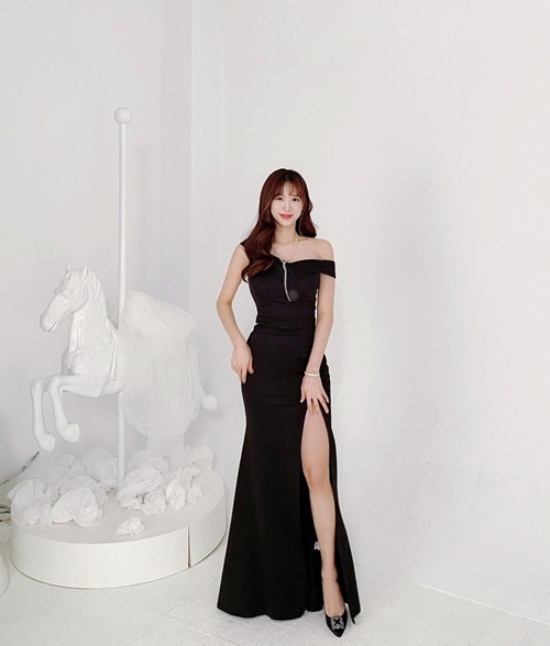 写真を見ると、黒のスリットドレスに身を包んだキム・ハンナがカメラに向かってポーズを披露している。