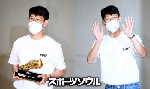 この日、ソン・フンミンは白の半袖Tシャツにジーンズというシンプルなコーディネートで報道陣やファンの前に登場。得点王に与えられるゴールデンブーツを手に、笑顔で写真撮影に応じていた。