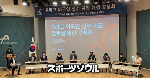 8月11日、ソウル新門路(シンムンロ)の牙山(アサン)政策研究院大講堂で行われたKリーグ外国籍選手制度改正のための公聴会で、全北現代のシン・ジョンミン責任マネージャーは、「リーグの質と発展の可能性を引き上げることを目指すべきだ。ファンのニーズに合わせて競技力を向上させるためにも、拡大に同意する。他国リーグと比較されることも念頭に置かなければならない。(近年のACLでは)東南アジア勢も良い結果を出している」と、拡大に同意する意見を明らかにした。