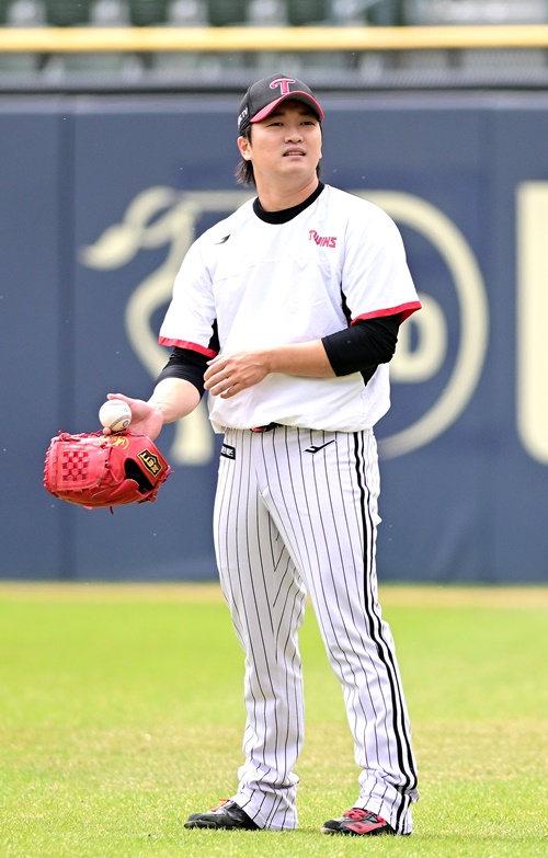 キム・ギョンテ投手コーチから専属でコーチングを受けながら、外野で軽くキャッチボールを行ったコ・ウソク。最初は笑顔でボールを投げていたが、徐々に強度を高め、最後は実際に登板しているかのように全力でピッチングをしていた。