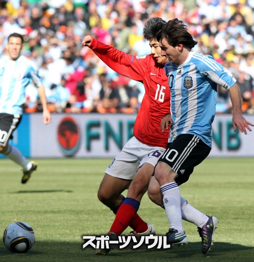 2010年南アフリカW杯でマッチアップしたキ・ソンヨン(写真中央・16番)とメッシ