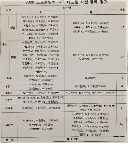 韓国野球委員会(KBO)が3月12日に野球会館で開催した技術委員会で、東京オリンピック最終エントリーの構成に向けた事前登録リストを確定した。人員制限なく、幅広く検討した結果、計111人が登録されたという。