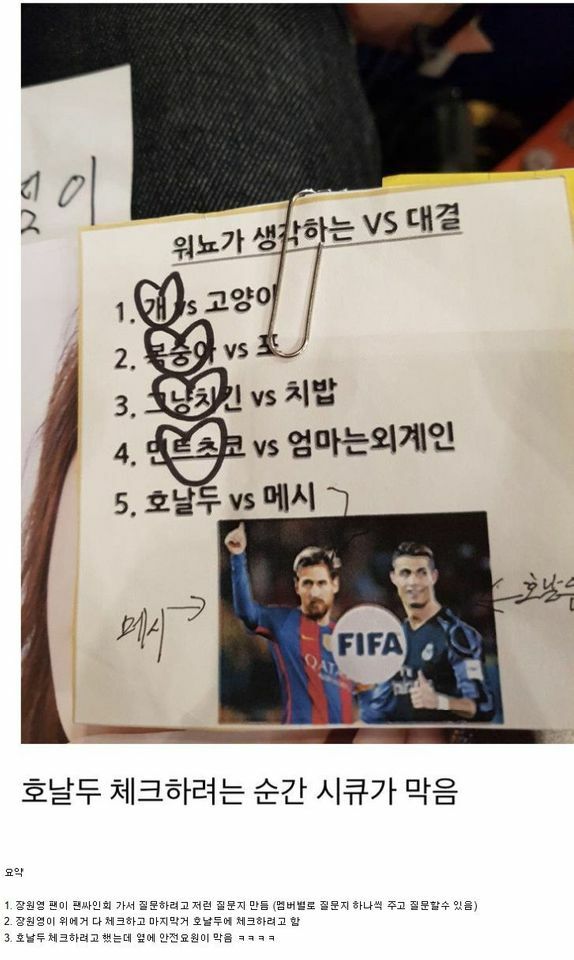 質問シートを受け取ったチャン・ウォニョンは各質問に対して“犬”、“チキン単品”、“ミントチョコ”の項目をハートマークで囲み、自身の好みを伝えた。