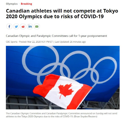 カナダの公営放送『CBC』は3月23日(日本時間)、カナダオリンピック委員会とパラリンピック委員会が、東京五輪が延期されることなく予定されたスケジュールで開幕した場合、選手団の派遣を拒否するだろうと速報形式で伝えた。