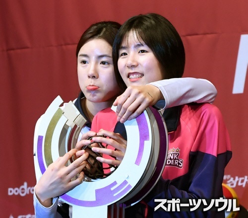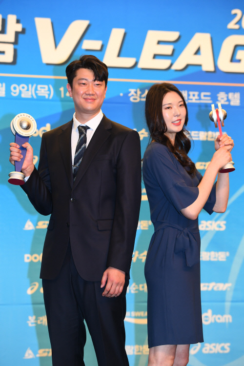 (写真提供=KOVO)男子部MVPのナ・ギョンボク(写真左)と女子部MVPのヤン・ヒョジン