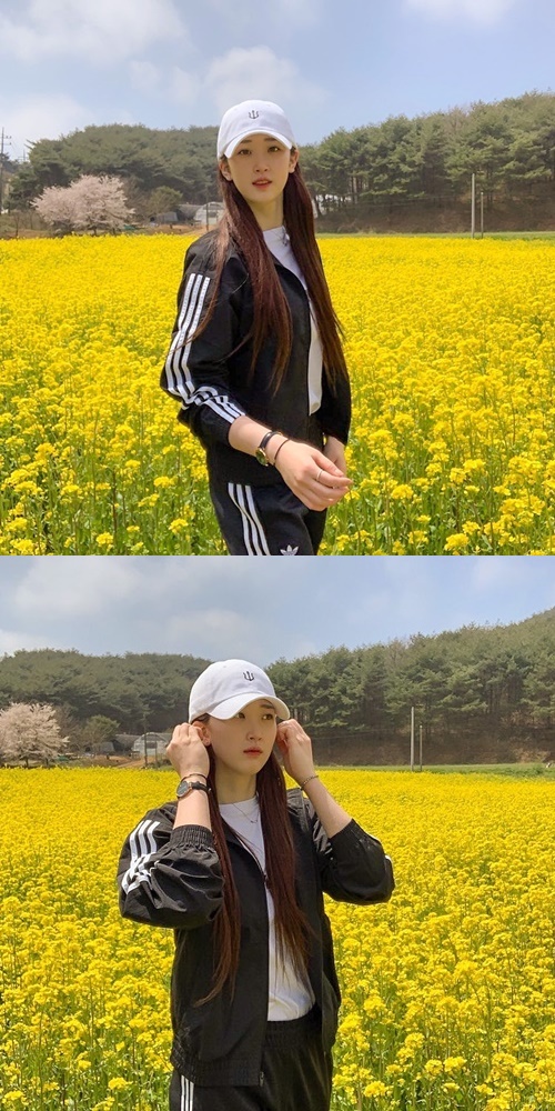 写真の中のコ・イェリムはスポーティな服装に身を包み、一面に広がる菜の花畑をバックにカメラを見つめている。
