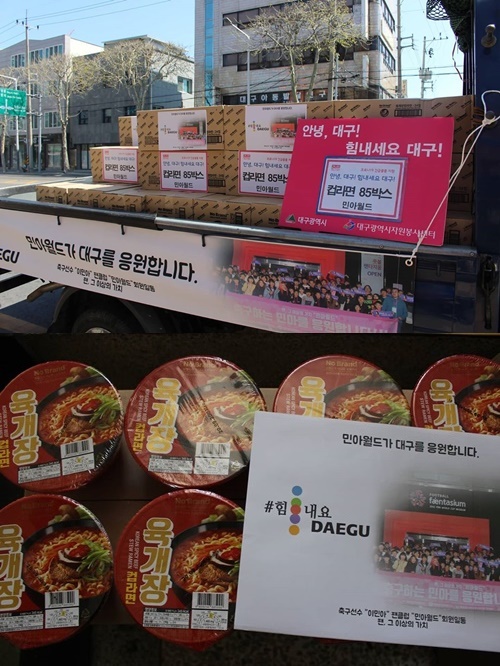 掲載された写真には、トラックいっぱいに段ボールが積まれている。段ボールには「頑張ろう、大邱!カップラーメン85ボックス ミナワールド」と書かれた紙が貼られていた。内容はユッケジャン味のカップラーメンのようだ。
