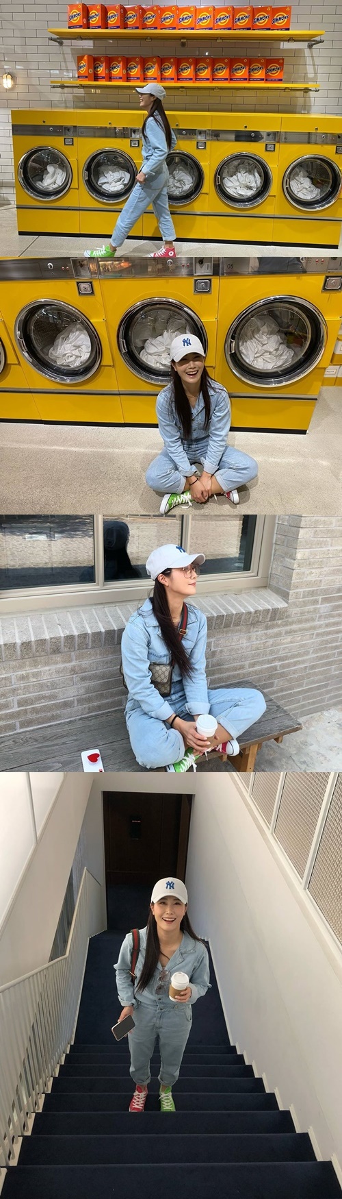 写真の中のキム・ハヌルはヤンキースの野球帽をかぶり、薄色の上下デニムに身を包んでいる。緑と赤と左右色違いのスニーカーも、彼女のファッションセンスの良さを引き立てている。