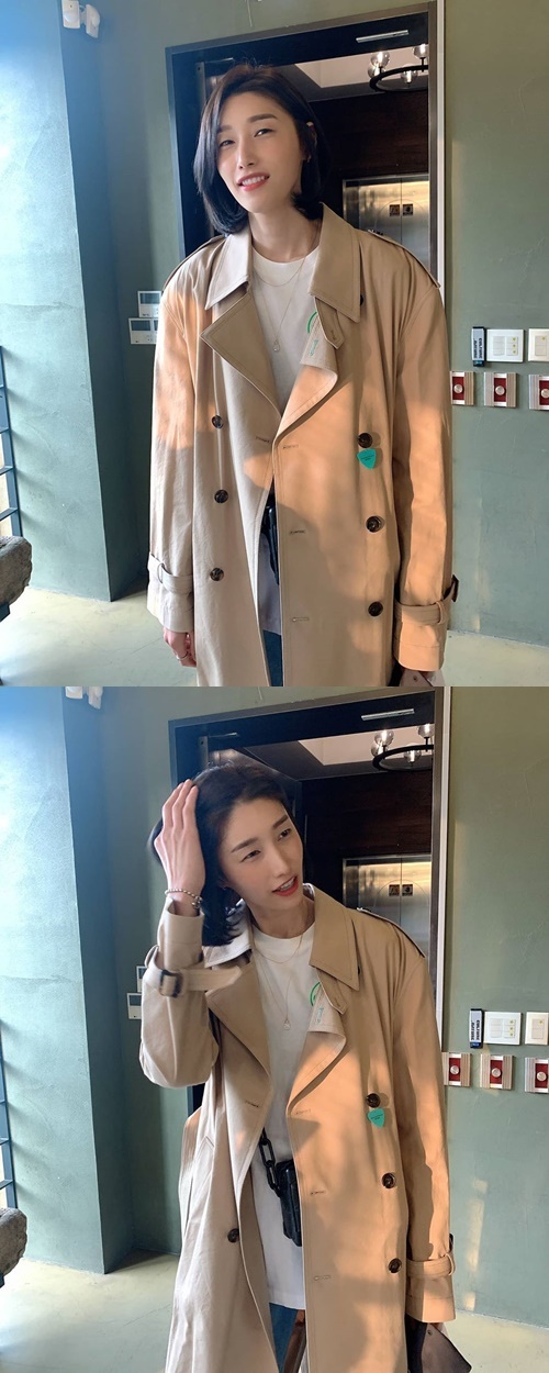 キム・ヨンギョンは春らしさを演出したベージュのトレンチコートを羽織り、笑顔でカメラを見つめている。髪をかき上げる姿もまた、ファンを魅了させた。