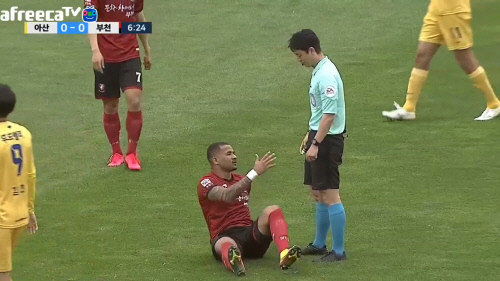 前半6分、忠南牙山のペナルティボックス付近で富川のブラジル人FWバイアーノ(25)がファウルを受けて転倒した。