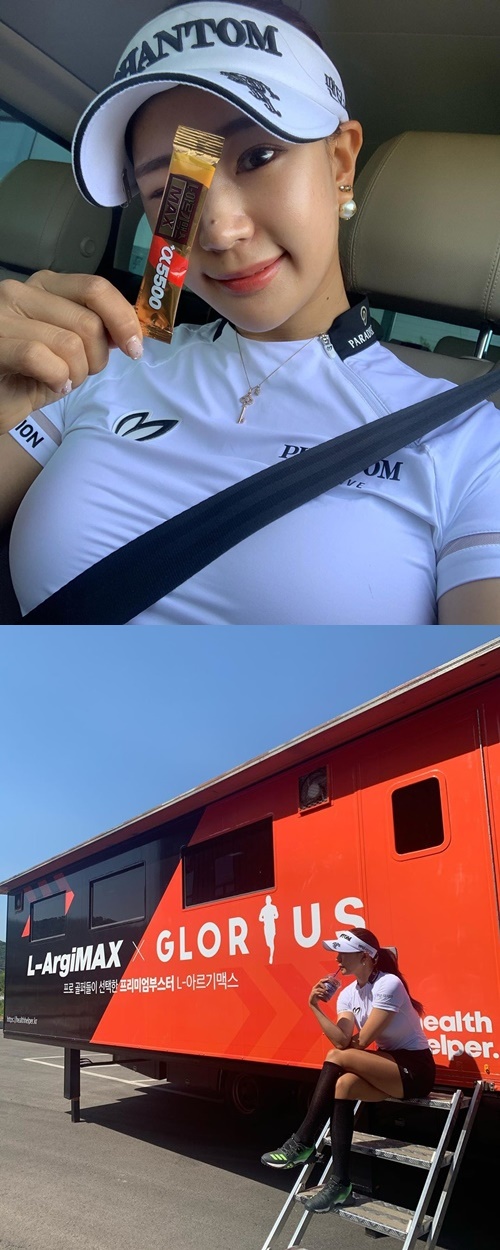 写真の中のユ・ヒョンジュは白いゴルフウェアを着用し、韓国のサプリメント“L-アルギマックス”を片手にカメラを見つめている。もう一枚の写真ではユ・ヒョンジュがステップに座り、ミニスカートから伸びる美脚を披露している。