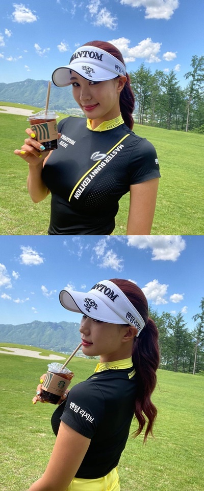 写真の中のユ・ヒョンジュは黒を基調としたゴルフウェアに白のサンバイザーを合わせ、青空広がるゴルフ場のなかコーヒーを片手に微笑んでいる。手にしているのはスターバックスのコーヒーのようだ。