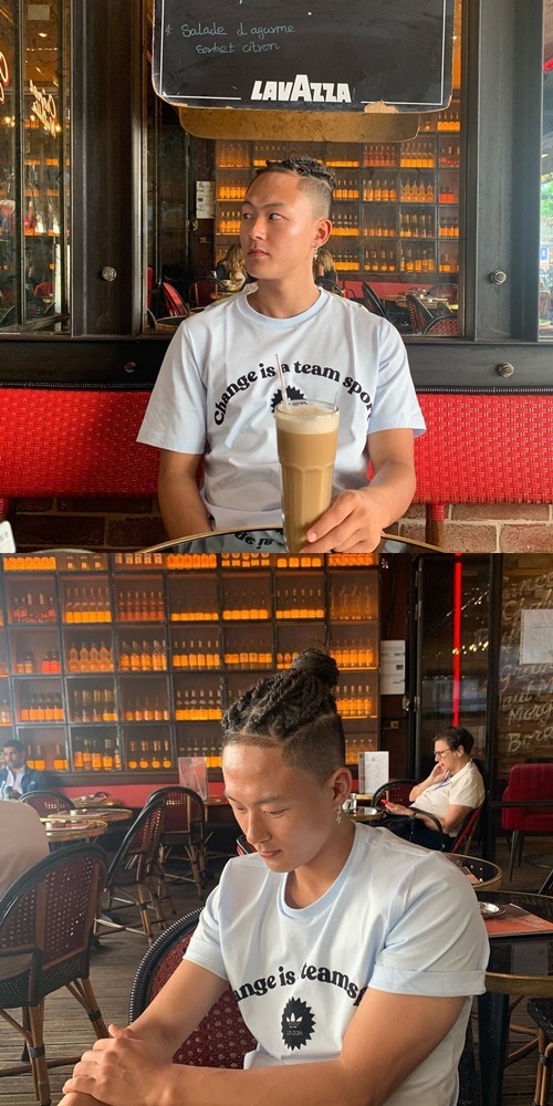 カフェでくつろぐ2枚の写真を投稿したのだが、その髪型が衝撃的だった。