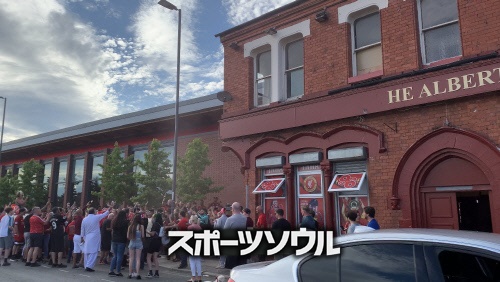 遅い時間にもかかわらず、リバプールのユニホームを着た子どもが親と手を握っていた。年配の老夫婦の姿も少なくなかった。チケット売り場周辺では紅炎が噴き出され、リバプールの応援歌が鳴り響いた。