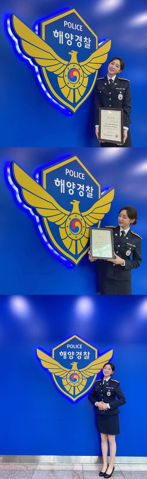 写真の中のアン・ジヒョンは女性警察官の姿を披露し、海洋警察のエンブレムの横でポーズを取っている。