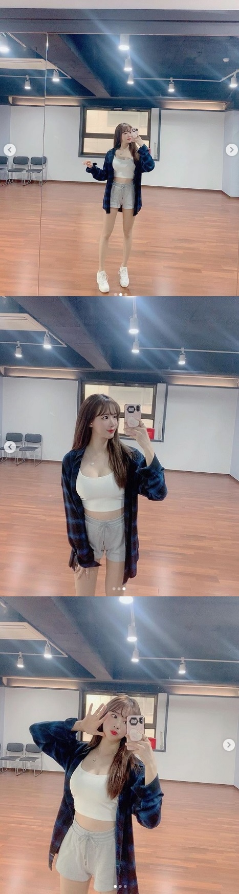 公開された写真でキム・ハンナは、トレーニング部屋のような場所で自撮りをしている。引き気味の写真ではバランスの良い美スタイルを見せつけ、アップの写真では美貌を誇った。