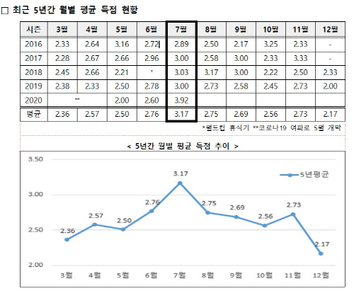 7月14日、韓国プロサッカー連盟が発表した最近5年間(2016~2020年)の月平均得点分布の資料を見ると、シーズン開幕から徐々に増加して「7月に最高値」を記録し、以降は減少傾向を見せている。