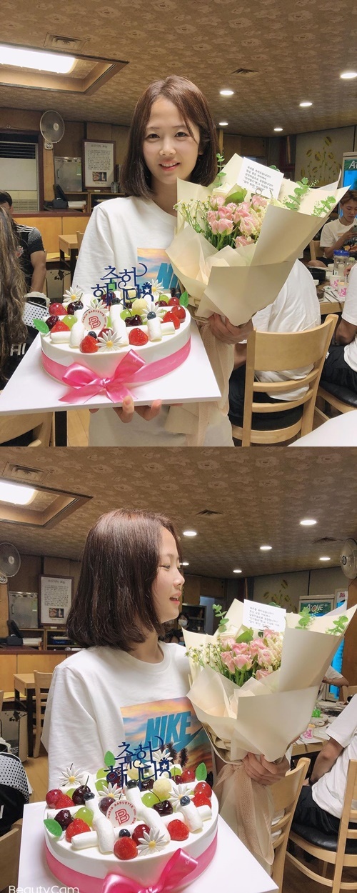 写真の中で、イ・ミナは“チュッカハムニダ(おめでとうございます)」と書かれたケーキや花束を抱え、喜びを表している。