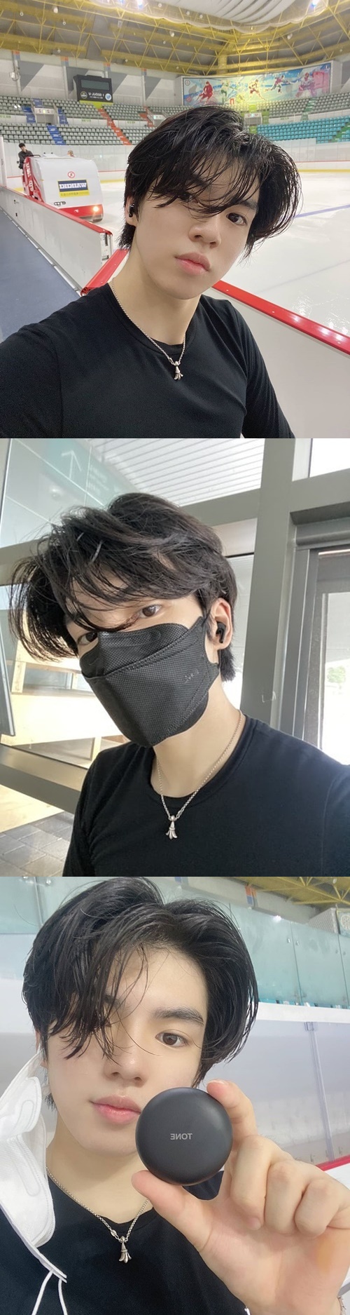 投稿を見ると、首元にネックレスがのぞく黒Tシャツ姿のチャ・ジュンファンが、LG電子から提供されたワイヤレスイヤホンを着用し、スケート場内で自撮りしてみせている。マスク越しからも伝わるその甘いマスクは、見る者の目を惹きつける。