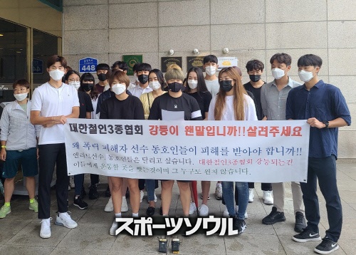 彼らは「降格とはどういう意味ですか。助けてください。なぜ暴力被害者、選手、同好人たちが被害を受けなければならないのですか。エリート選手や同好人たちは走りたいです。韓国トライアスロン協会の降格は彼らの活動の場所を奪うことです。誰も望んでいません。1次被害の選手たちに2次被害を与えないよう、助けてください」と書かれた垂れ幕を掲げた。
