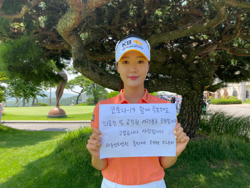 手書きで書かれたメッセージには、「新型コロナをともに克服しましょう。医療陣や教職員の皆様を応援します。ありがとうございます。愛しています。ソウル聖母病院広報大使オ・ジヒョン・プロゴルファー」と書かれている。
