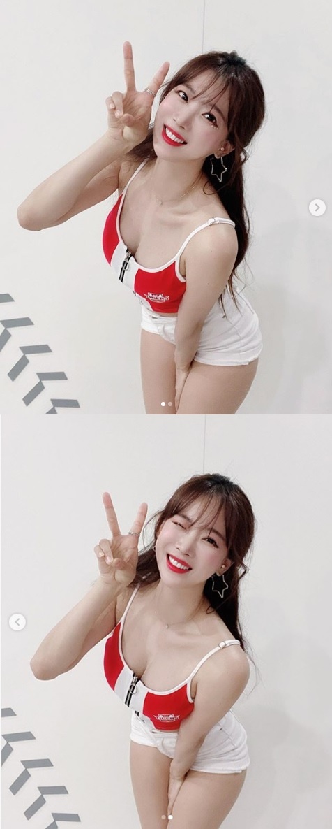 投稿された写真でキム・ハンナは、実際に球場でチアリーディングするときに着用するような、キャミソールにホットパンツという動きやすい格好。明るい笑顔を浮かべ、ピースしながらカメラを見つめている。