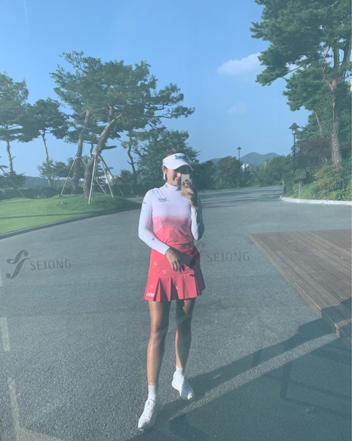 写真を見ると、白と赤のグラデーションが特徴的なゴルフウェア姿のアン・ソヒョンが、鏡に向かってキュートにほほ笑んでみせている。そのかわいらしさはさることながら、ミニスカートからスラリと伸びた美脚も見る者の目を引く。