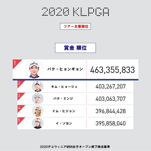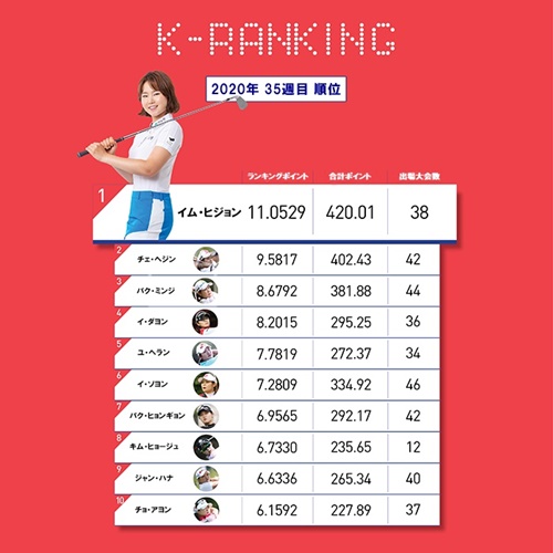 韓国女子プロゴルフ協会(KLPGA)は8月31日、2020シーズン35週目のKランキング及び主要部門の順位を発表した。