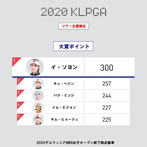 年間MVPに相当する大賞ポイントでは、イ・ソヨン(23)が2位チェ・ヘジン(21)と43ポイント差の300ポイントで1位につけた。イ・ソヨンはほかにも賞金ランキングで5位、平均ストロークで3位にランクインしており、今後のさらなる活躍にも期待できそうだ。