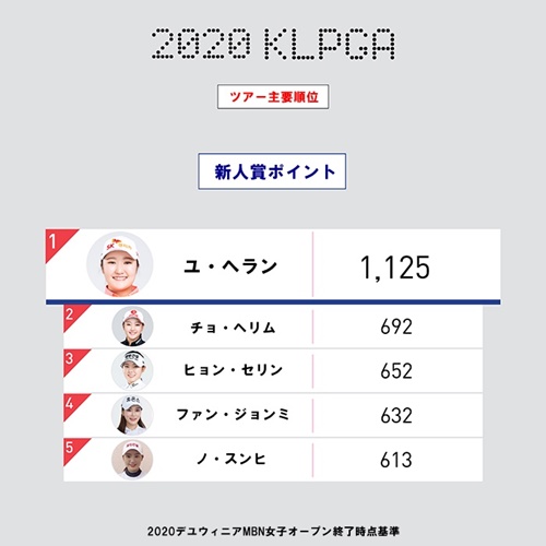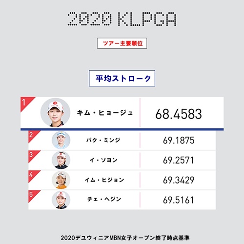 また今シーズン唯一2勝を挙げているパク・ヒョンギョン(20)が賞金ランキングでトップを走り、平均ストロークでは米国女子ツアー勢のキム・ヒョージュ(25)が「68.4853」で頭一つ飛び抜けている。新人王争いでは、2年連続で「済州三多水マスターズ」(7月30日~8月2日)を制した”元スーパー中学生”のユ・ヘラン(19)が独走状態にある。