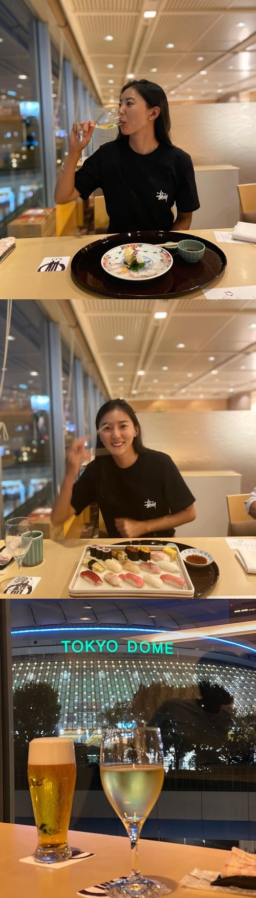 写真を見ると、東京ドームが見えるレストランでワイン片手に和食をたしなむユン・チェヨンが写っている。キャプションに書かれているように、日本での久しぶりの外食を存分に楽しんでいる様子が伝わってくる。