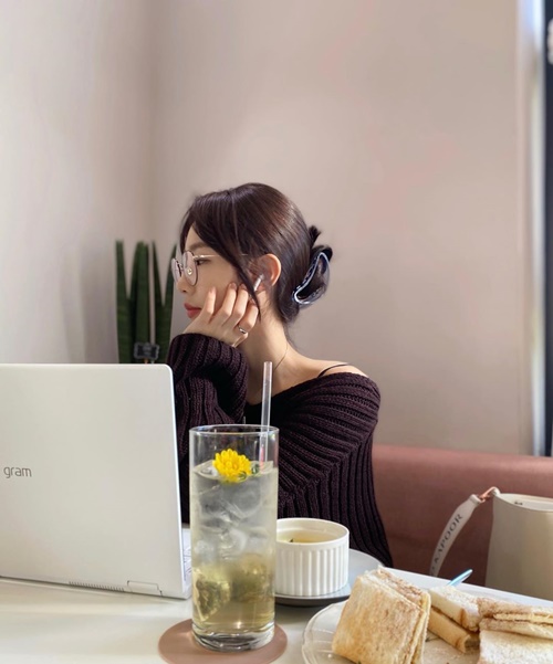 写真を見ると、バーガンディー色のニットを着用した眼鏡姿のチェ・ダビンが、パソコンの前で頬杖をつく様子が写っている。